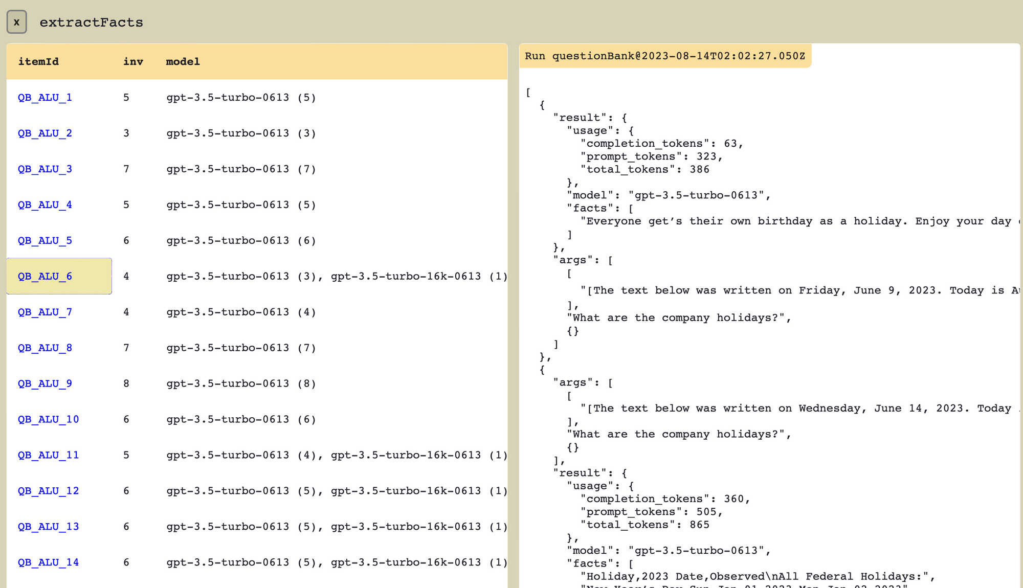 This worked for a while, until our evaluations grew long and it started to be too much effort to look at every single output. It also didn't offer us a good overview of the performance of the pipeline.