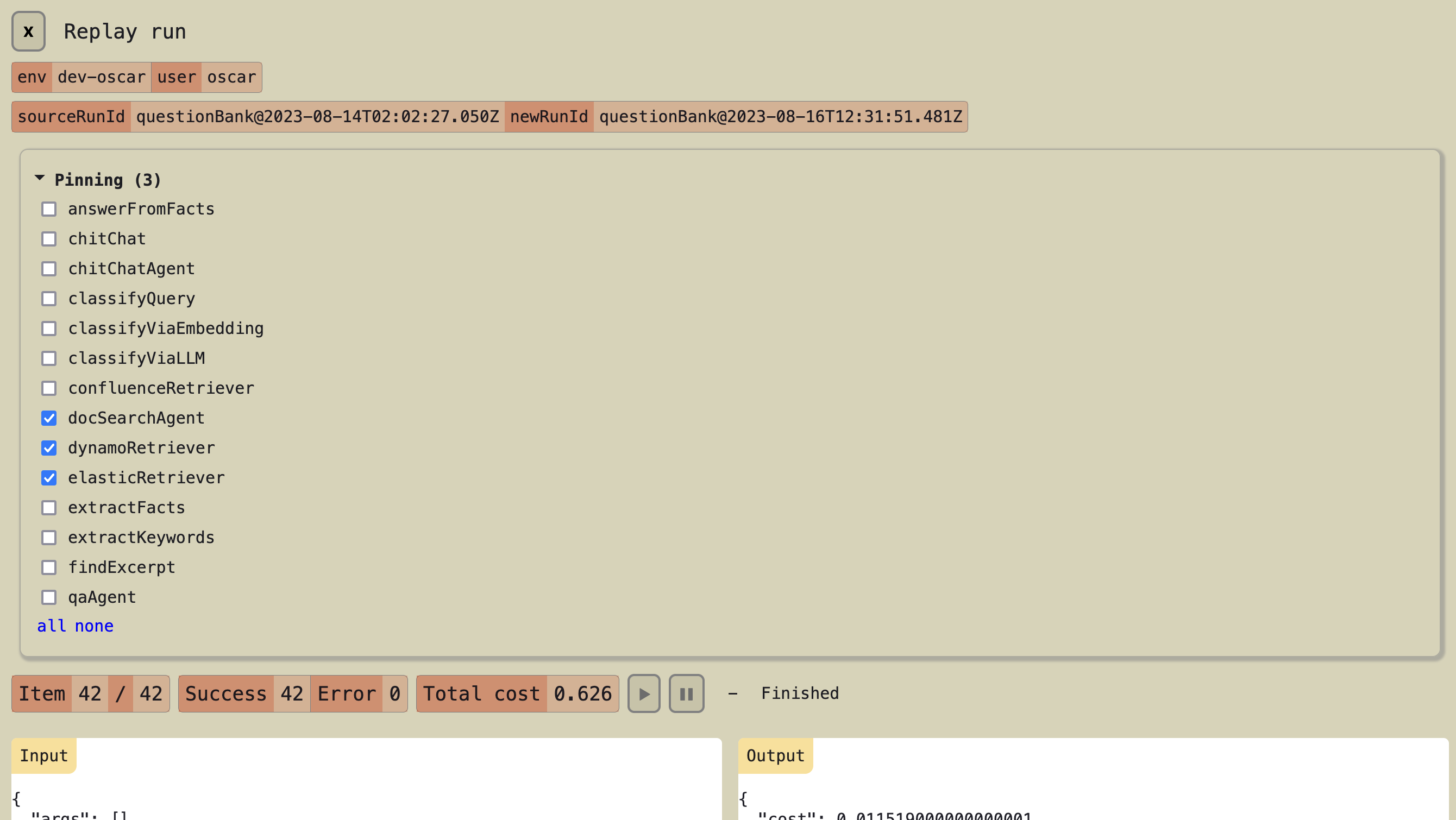 In order to test isolated changes in the pipeline, we can pin down parts of it so that the inputs and outputs remain consistent across runs. For example, we can pin down the output of the retrieval tasks to ensure that the input to downstream steps is consistent even if our Confluence test site has been updated between two runs. This is particularly useful for LLM-based steps, where costs can run up quickly for large evals and output is not deterministic.