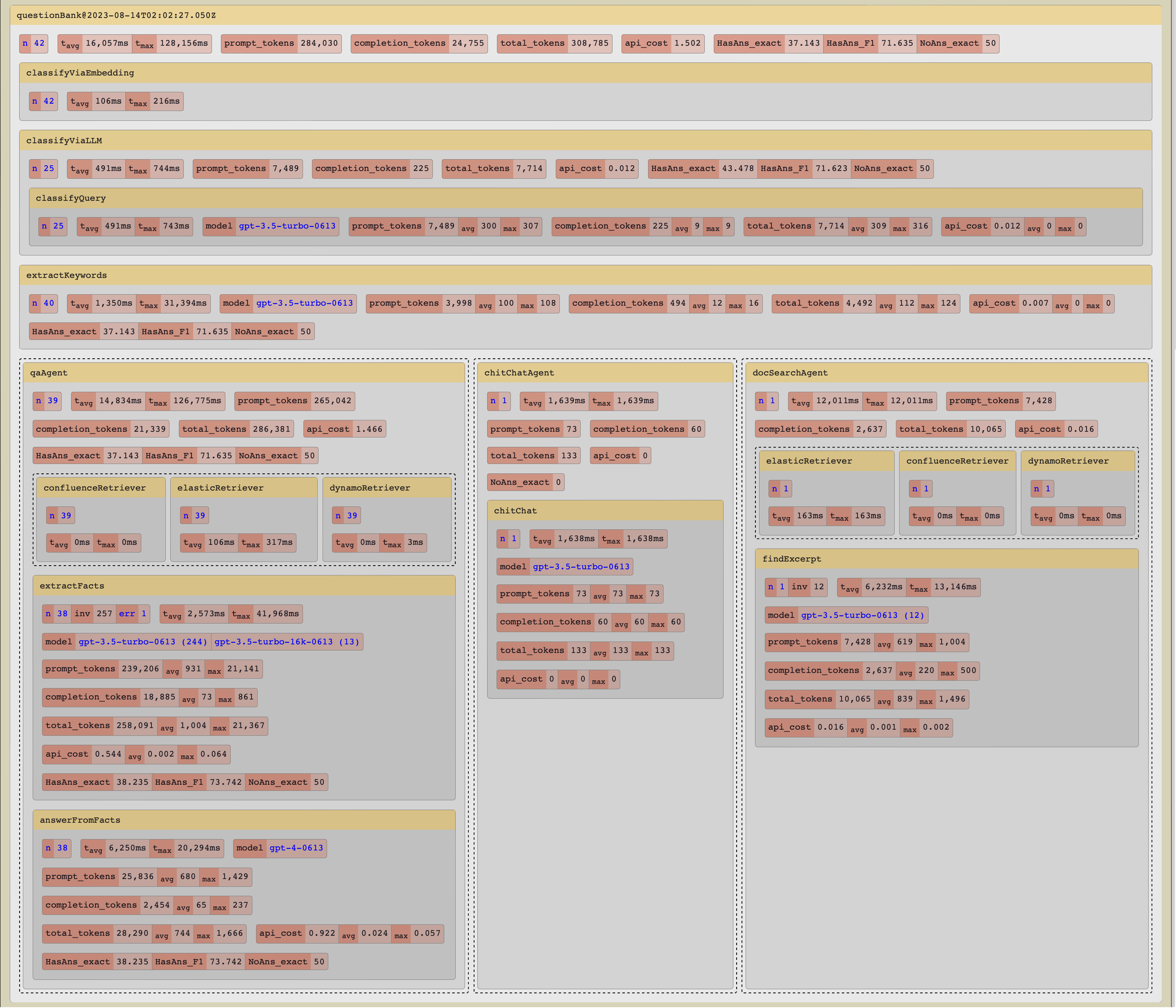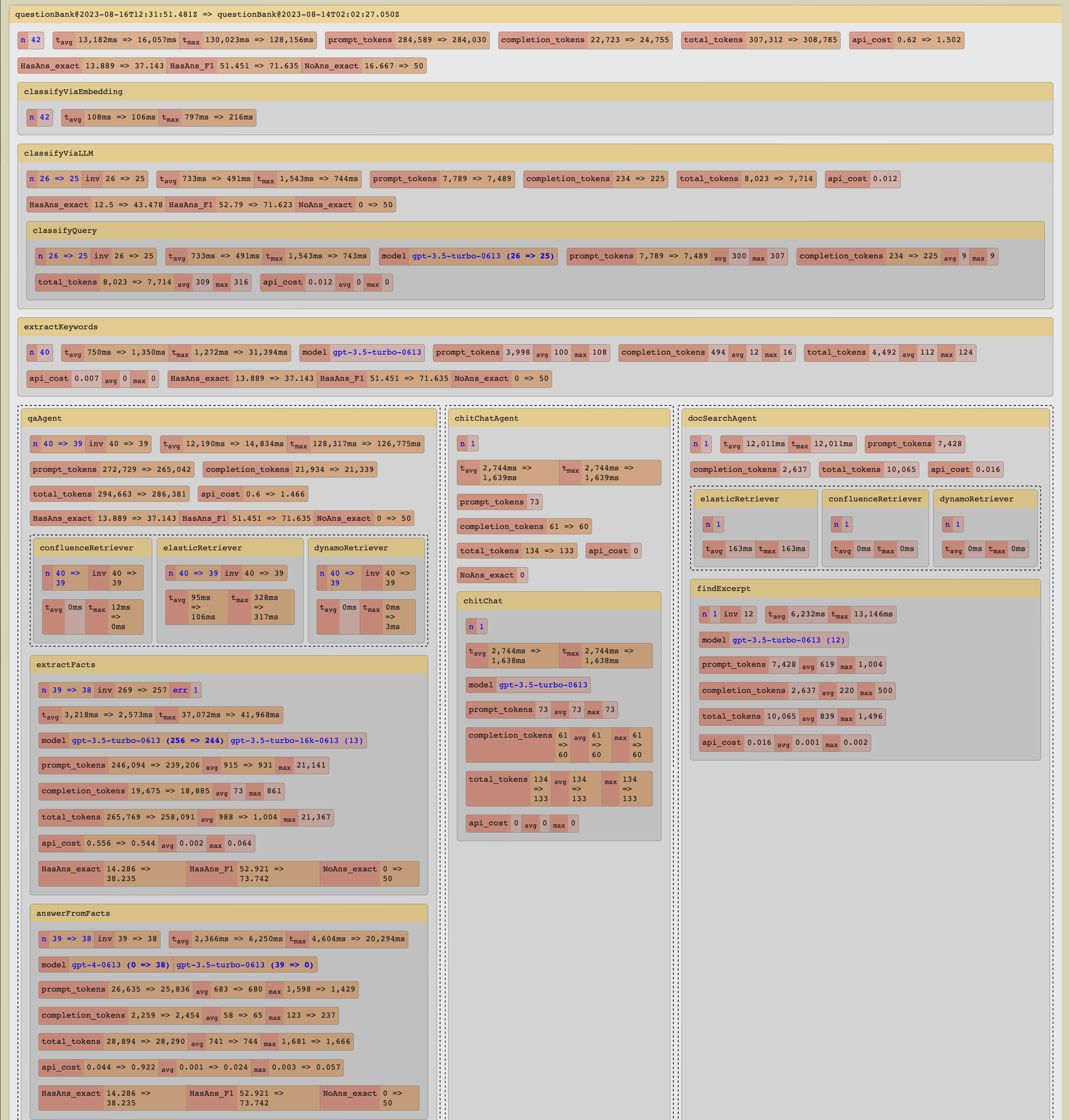 Gaucho also allows us to compare between runs to see what has changed. For example, it shows us that our use of GPT-4 instead of GPT-3.5 in the final output step of the pipeline improves the quality of our answers, but it also nearly triples our overall costs and increases overall average latency by 20%. We can selectively test the effects of such replacements in different parts of the pipeline, and make more informed decisions.