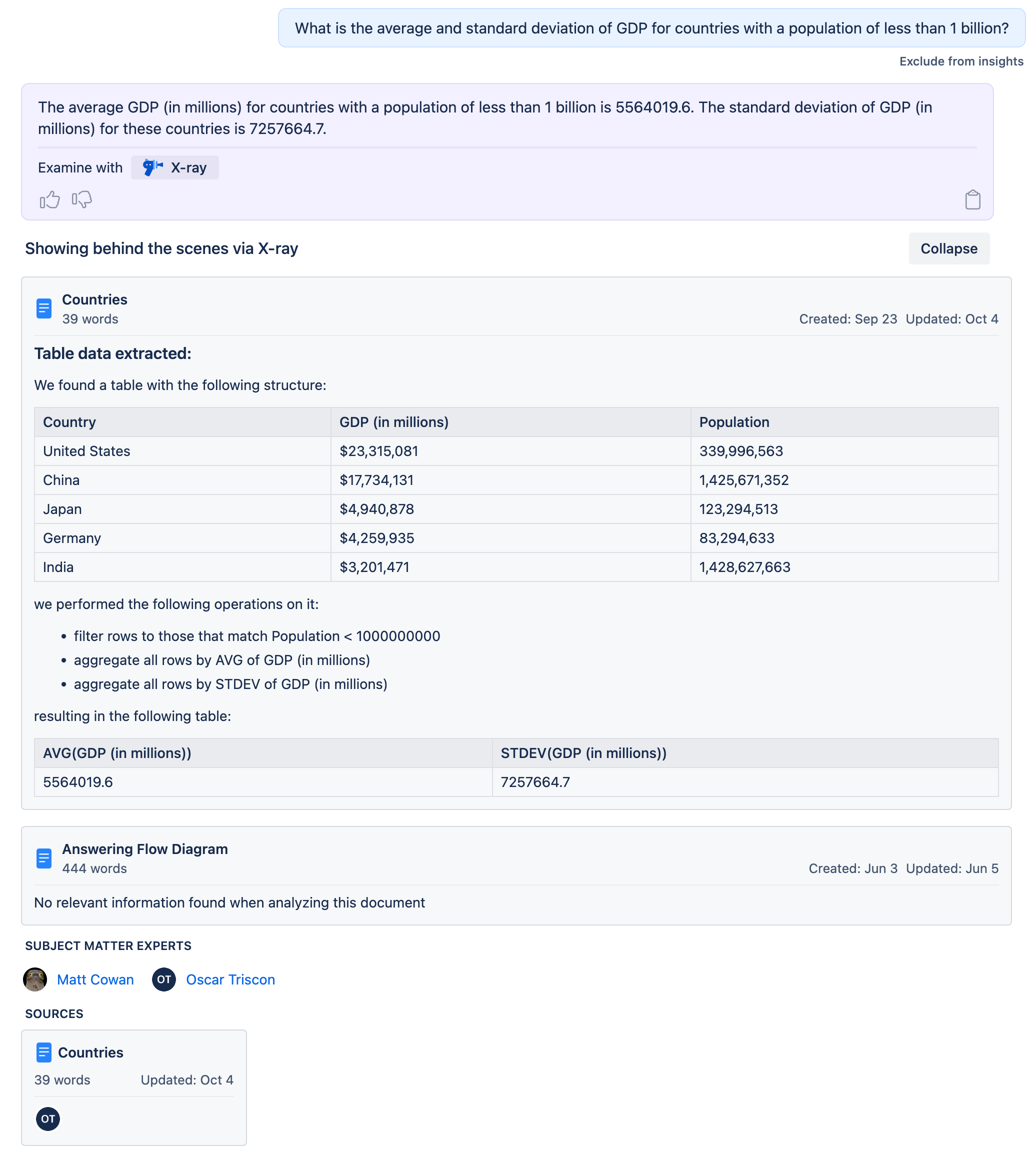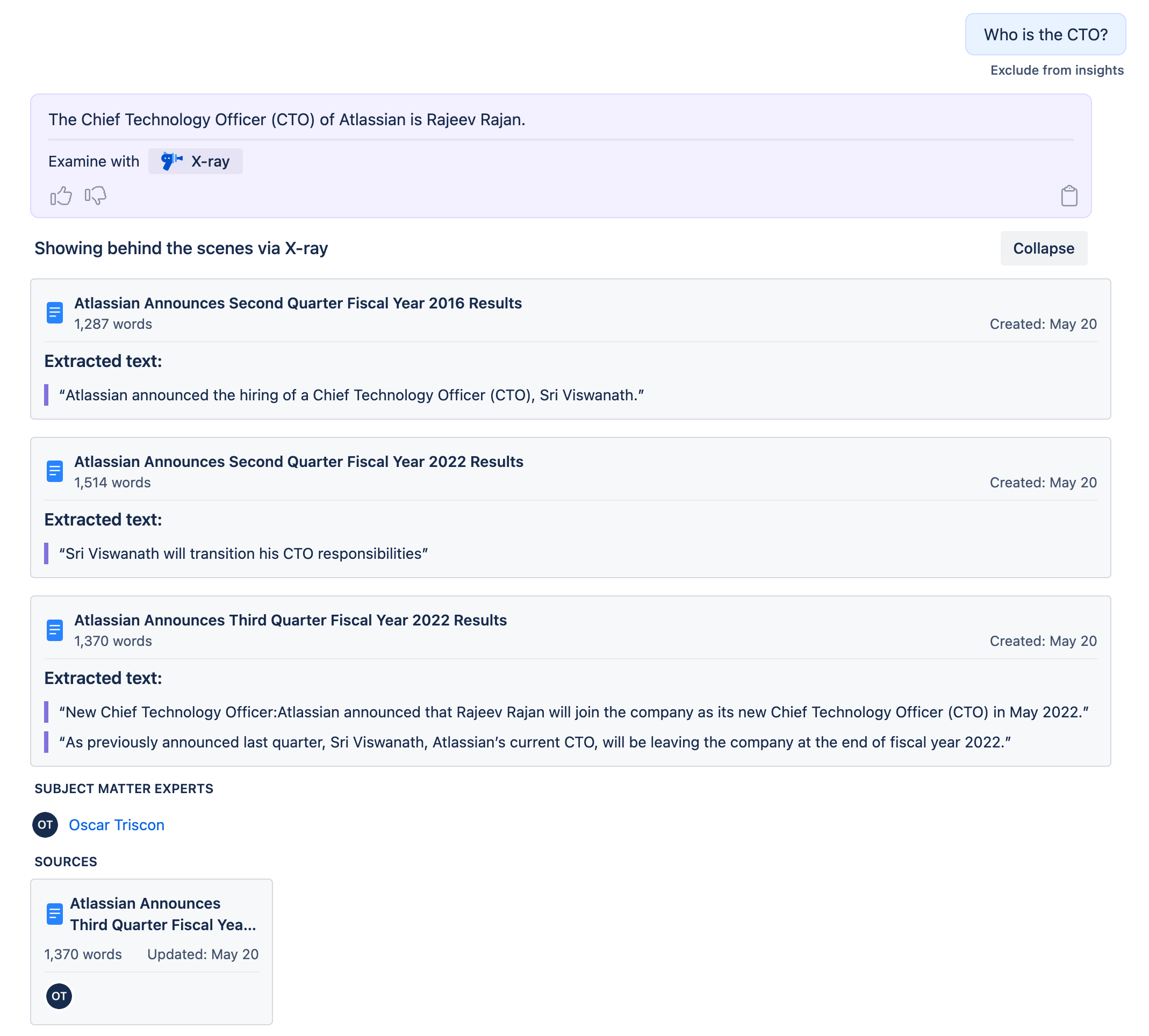 In this blog, we've talked in the past about some of the inner workings of Connie. The key insight that allowed the leap to X-ray was that all of the intermediary information that we process and create when answering a question in Confluence is also the perfect information for a user to fact-check Connie.